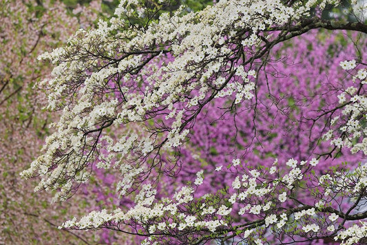 Flowering dogwood tree and distant Eastern redbud-Kentucky Black Ornate Wood Framed Art Print with Double Matting by Jones, Adam