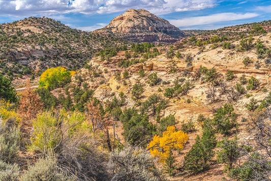 Colorful yellow cottonwood trees White Red Mountain Autumn-Canyonlands National Park-Needles Distri Black Ornate Wood Framed Art Print with Double Matting by Perry, William