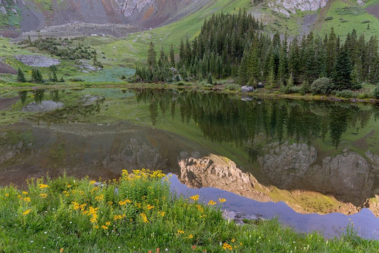 USA-Colorado-Uncompahgre National Forest Mountain wildflowers and pond landscape Black Ornate Wood Framed Art Print with Double Matting by Jaynes Gallery