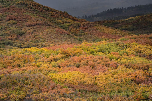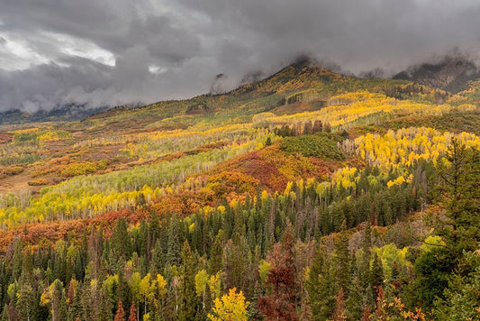USA-Colorado-Uncompahgre National Forest Autumn-colored forest and rain clouds Black Ornate Wood Framed Art Print with Double Matting by Jaynes Gallery