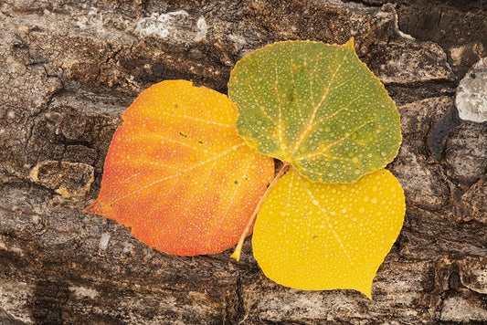 USA-Colorado-Uncompahgre National Forest Wet aspen leaves on log Black Ornate Wood Framed Art Print with Double Matting by Jaynes Gallery
