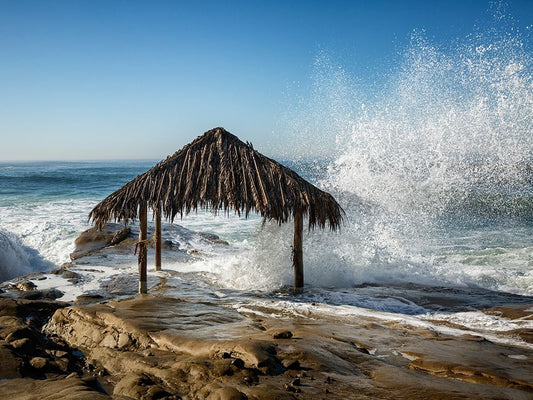 USA-California-La Jolla High surf at high tide inundates Windansea Surf Shack Black Ornate Wood Framed Art Print with Double Matting by Collins, Ann