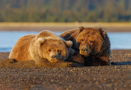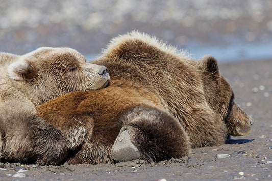 Adult female grizzly bear and cub sleeping on beach at sunrise-Lake Clark National Park and Preserve Black Ornate Wood Framed Art Print with Double Matting by Jones, Adam