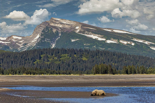 Grizzly bear resting on beach with mountain backdrop-Lake Clark National Park and Preserve Black Ornate Wood Framed Art Print with Double Matting by Jones, Adam