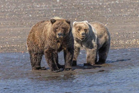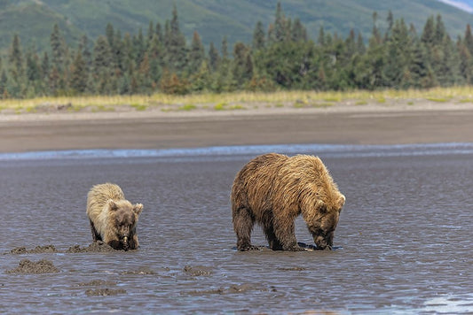 Adult female grizzly bear and cub clamming-Lake Clark National Park and Preserve-Alaska Black Ornate Wood Framed Art Print with Double Matting by Jones, Adam