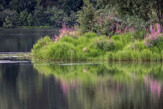 Fireweed blooming on small island in lake-Margaret Eagan Sullivan Park-Anchorage-Alaska Black Ornate Wood Framed Art Print with Double Matting by Jones, Adam