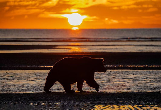 Adult grizzly bear silhouetted on beach at sunrise-Lake Clark National Park and Preserve Black Ornate Wood Framed Art Print with Double Matting by Jones, Adam