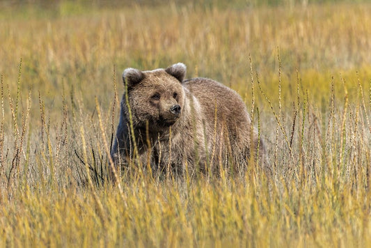 Adult female grizzly bear crossing grassy meadow-Lake Clark National Park and Preserve-Alaska Black Ornate Wood Framed Art Print with Double Matting by Jones, Adam