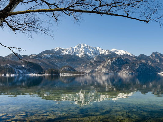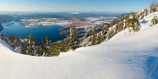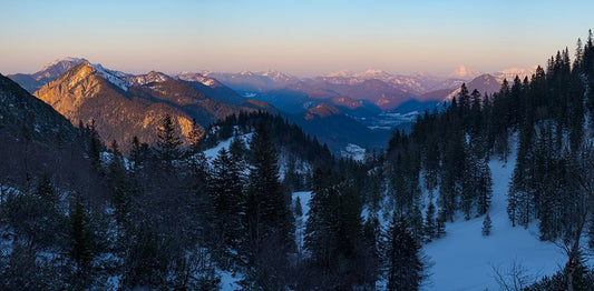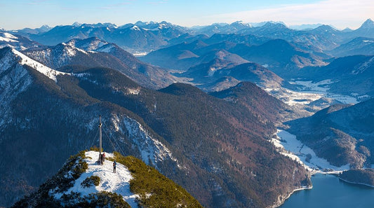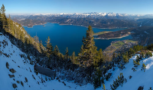 The view from Mt-Fahrenberg-Kopf towards lake Walchensee and Karwendel mountain range during winter Black Ornate Wood Framed Art Print with Double Matting by Zwick, Martin