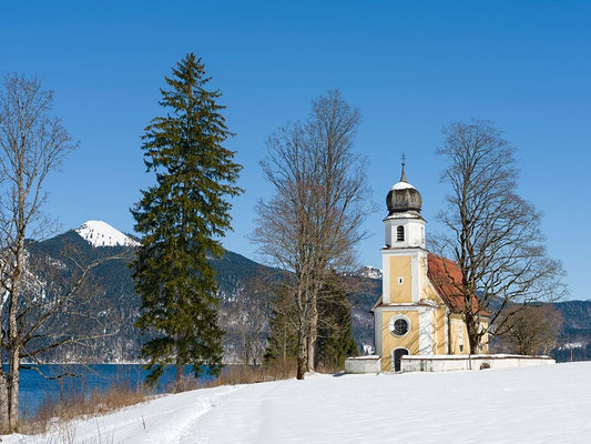 Church Sankt Margareth at Zwergern Spitz-Lake Walchensee near village Einsiedl in the snowy Bavaria Black Ornate Wood Framed Art Print with Double Matting by Zwick, Martin