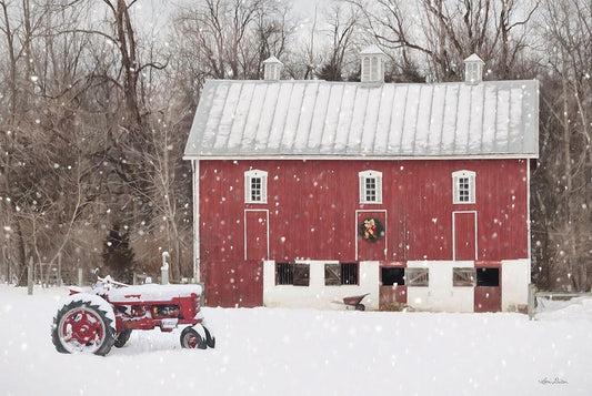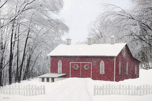 Winter Red Barn Black Ornate Wood Framed Art Print with Double Matting by Deiter, Lori