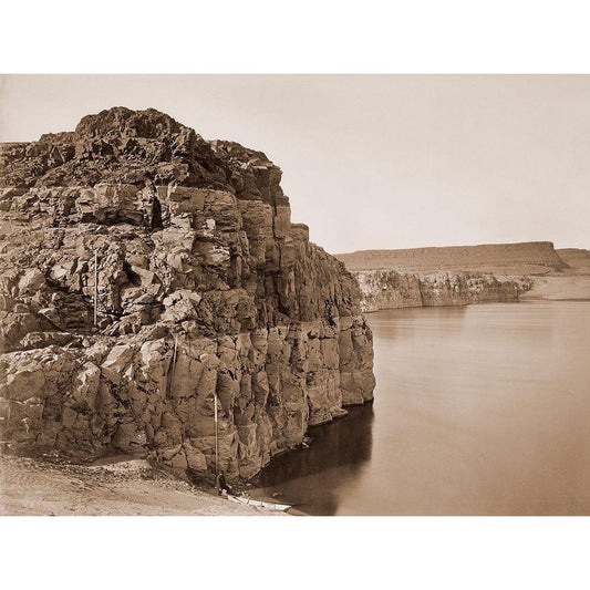 The Dalles, Extremes of High and Low Water, 92 ft./Head of the Dalles, Columbia River, Oregon, about Black Modern Wood Framed Art Print with Double Matting by Watkins, Carleton