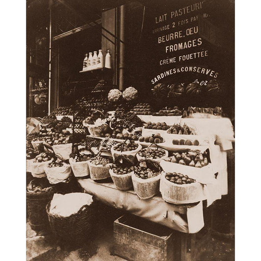 Rue Sainte-Opportune - Produce Display, rue Sainte-Opportune. Sepia Black Modern Wood Framed Art Print with Double Matting by Atget, Eugene