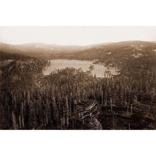 Dams and Lake, Nevada County, California, Distant View, about 1871 Black Modern Wood Framed Art Print with Double Matting by Watkins, Carleton