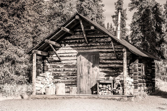 Small- rustic log home in sepia. Black Modern Wood Framed Art Print by Muir, Janet