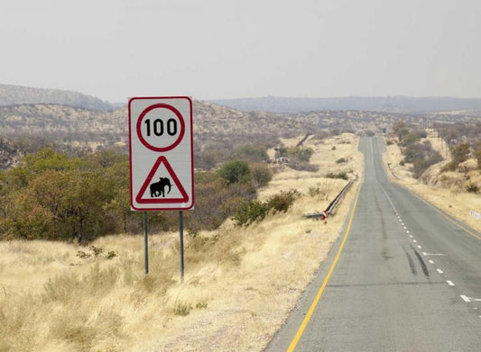 Namibia, Etosha NP Speed limit and caution sign White Modern Wood Framed Art Print with Double Matting by Kaveney, Wendy