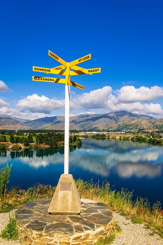 Location sign at the Bruce Jackson Lookout-Cromwell-Central Otago-South Island-New Zealand White Modern Wood Framed Art Print with Double Matting by Bishop, Russ