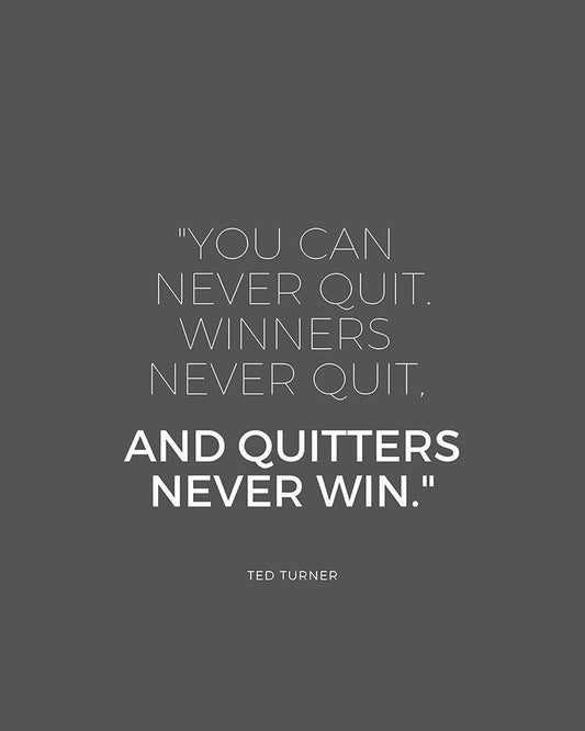 Ted Turner Quote: Never Quit White Modern Wood Framed Art Print with Double Matting by ArtsyQuotes