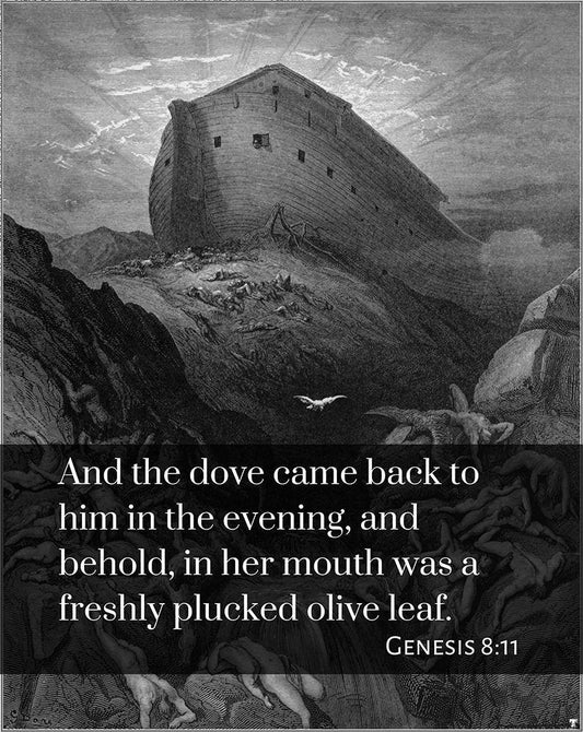 Bible Verse Quote Genesis 8:11, Gustave Dore - The Dove sent forth from the Ark White Modern Wood Framed Art Print with Double Matting by ArtsyQuotes