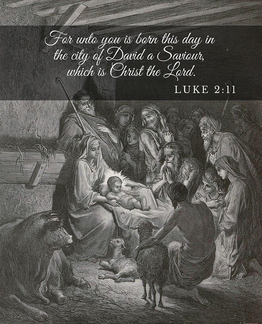 Bible Verse Quote Luke 2:11, Gustave Dore - The Birth of Jesus White Modern Wood Framed Art Print with Double Matting by ArtsyQuotes