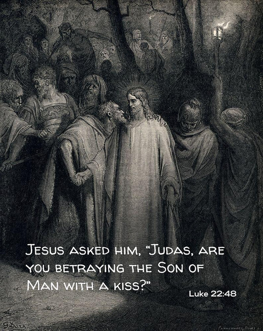 Bible Verse Quote Luke 22:48, Gustave Dore - The Judas Kiss White Modern Wood Framed Art Print with Double Matting by ArtsyQuotes