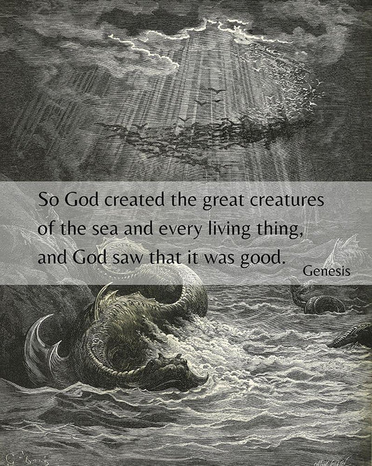 Bible Verse Quote Genesis 1:21, Gustave Dore - Creation of the Fish and Birds White Modern Wood Framed Art Print with Double Matting by ArtsyQuotes