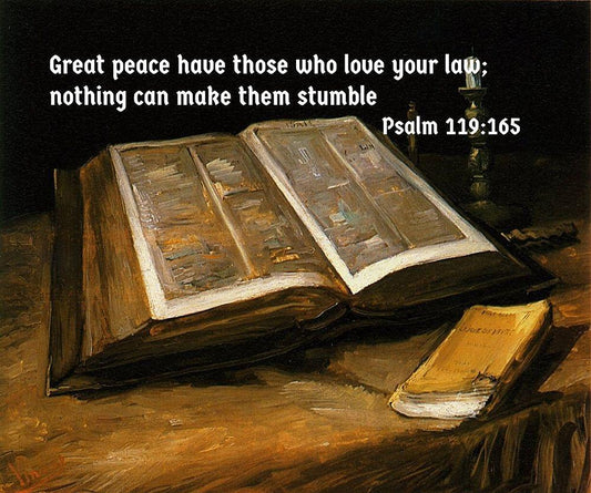 Bible Verse Quote Psalm 119:165, Vincent van Gogh - Still Life with Bible White Modern Wood Framed Art Print with Double Matting by ArtsyQuotes
