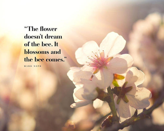 Mark Nepo Quote: Blossoms White Modern Wood Framed Art Print with Double Matting by ArtsyQuotes