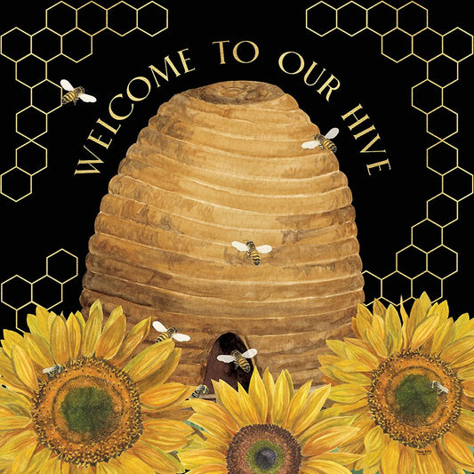 Honey Bees And Flowers Please on black III-Welcome White Modern Wood Framed Art Print with Double Matting by Reed, Tara
