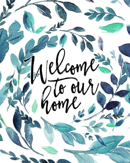 Welcome to Our Home - Blue White Modern Wood Framed Art Print with Double Matting by Moss, Tara