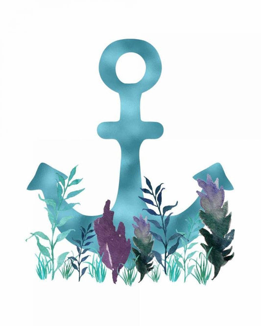 Teal Florals Blue Anchor White Modern Wood Framed Art Print with Double Matting by Moss, Tara