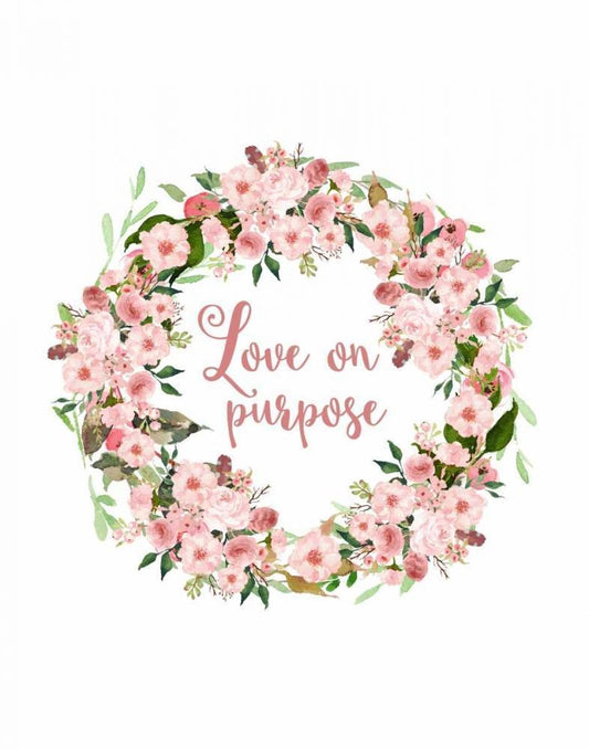 Love on Purpose Pink Wreath White Modern Wood Framed Art Print with Double Matting by Moss, Tara