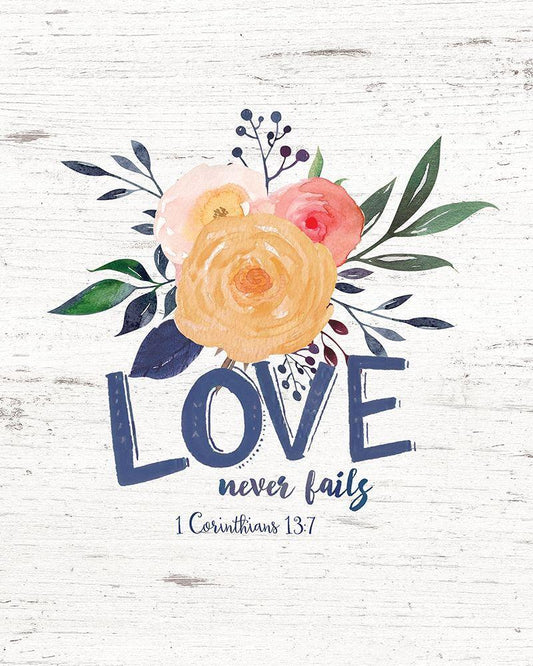 Love Never Fails White Modern Wood Framed Art Print with Double Matting by Moulton, Jo