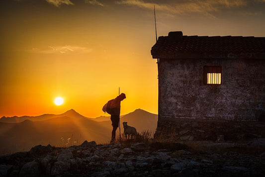 The Man-The Dog And The Windmills Black Ornate Wood Framed Art Print with Double Matting by Antonio Pardo, J.