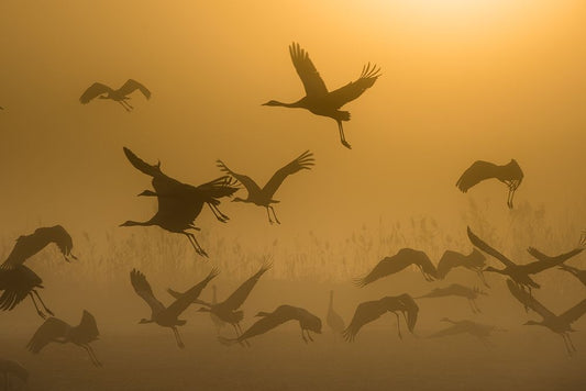 Sunrise With Cranes Black Ornate Wood Framed Art Print with Double Matting by Rosenblatt, Ronen