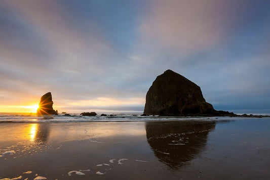 USA- Oregon. Cannon Beach and Haystack Rock at sunset White Modern Wood Framed Art Print with Double Matting by Gulin, Darrell