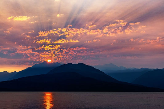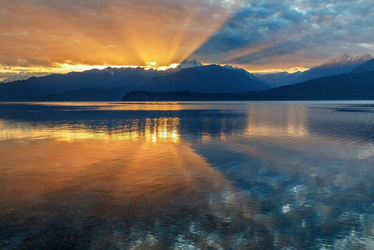 USA-Washington State-Seabeck Sunburst over Hood Canal and Olympic Mountains at sunset White Modern Wood Framed Art Print with Double Matting by Jaynes Gallery