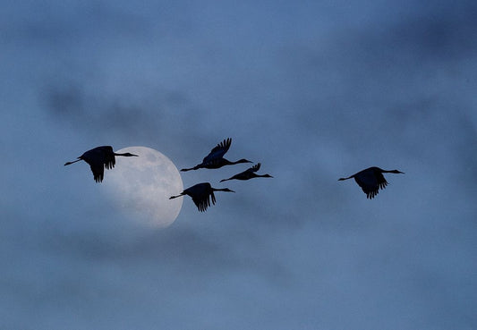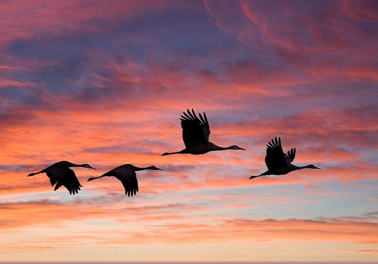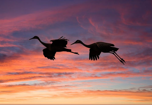 Sandhill cranes silhouetted flying at sunset Bosque del Apache National Wildlife Refuge-New Mexico White Modern Wood Framed Art Print with Double Matting by Jones, Adam