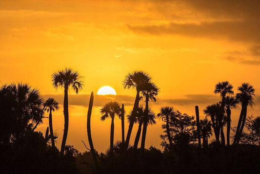 Sable palms silhouetted at sunrise on the Econlockhatchee River White Modern Wood Framed Art Print with Double Matting by Jones, Adam