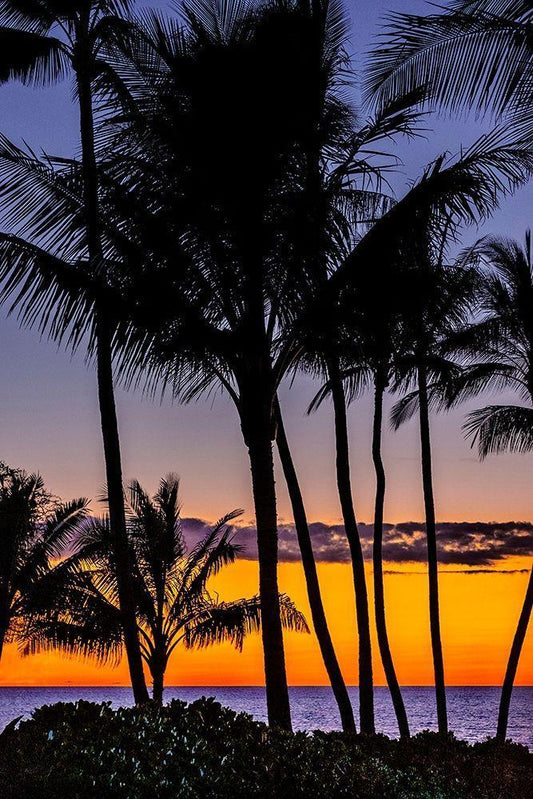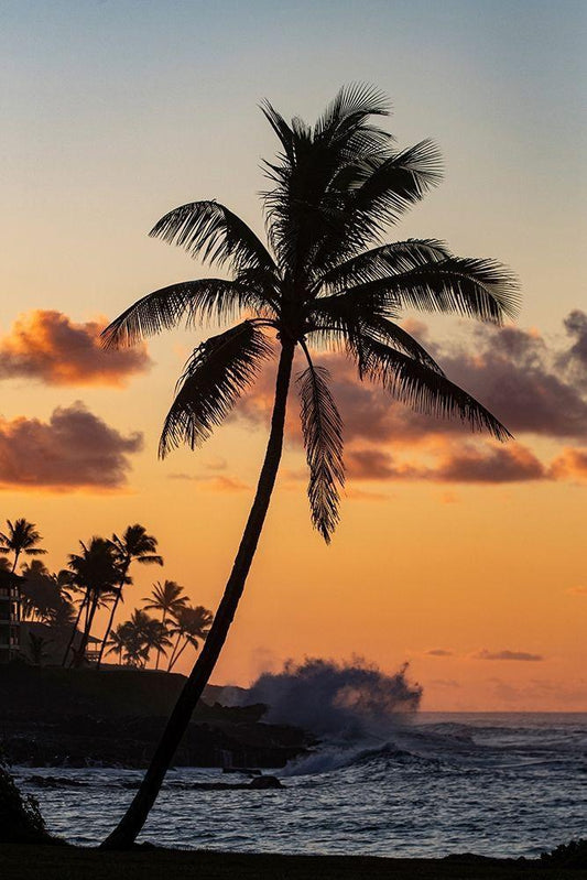 Coconut palm trees silhouetted against vivid sunrise clouds at Poipu Beach in Kauai-Hawaii-USA White Modern Wood Framed Art Print with Double Matting by Haney, Chuck