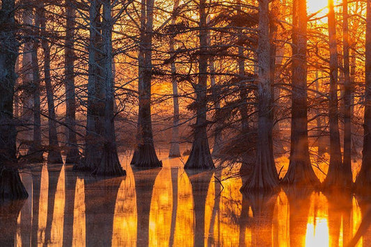 Cypress trees at sunset in fall Horseshoe Lake State Fish and Wildlife Area White Modern Wood Framed Art Print with Double Matting by Day, Richard and Susan