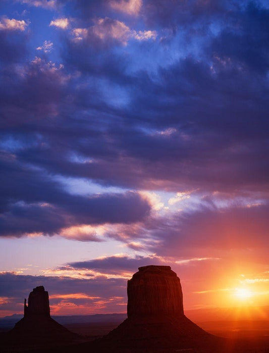 Arizona-Monument Valley Sunrise silhouettes of formations White Modern Wood Framed Art Print with Double Matting by Jaynes Gallery