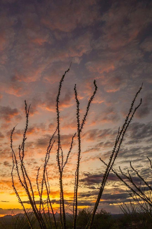 Arizona-Santa Cruz County Silhouette of ocotillo cactus at sunset White Modern Wood Framed Art Print with Double Matting by Jaynes Gallery