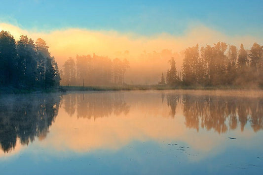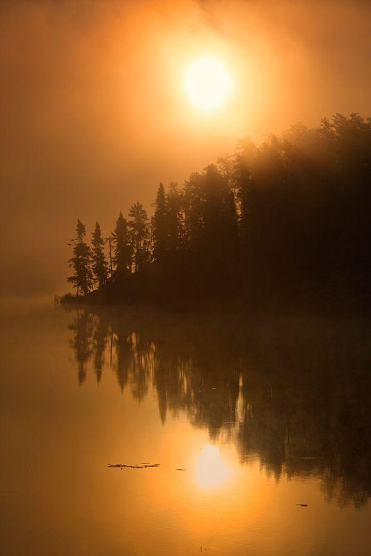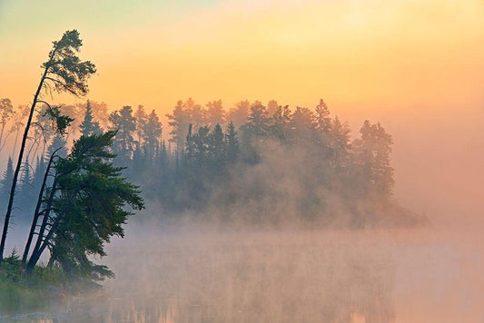 Canada-Ontario-Kenora Isabel Lake in fog at sunrise White Modern Wood Framed Art Print with Double Matting by Jaynes Gallery