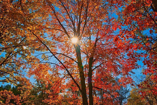 Canada-Ontario-Chutes Provincial Park Sunburst on autumn tree foliage White Modern Wood Framed Art Print with Double Matting by Jaynes Gallery