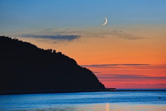 Canada-Quebec-Mont-Louis Crescent moon sunrise on Gulf of St Lawrence White Modern Wood Framed Art Print with Double Matting by Jaynes Gallery