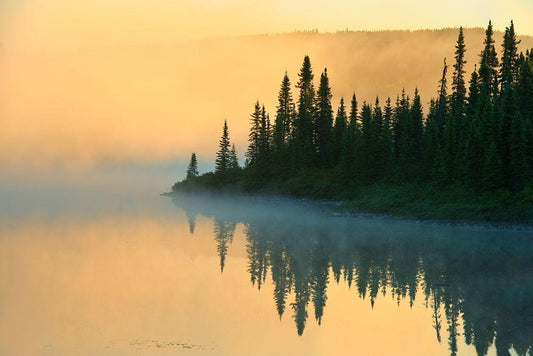 Canada-Quebec-Chibougamau Fog over Lac Sauvage at dawn White Modern Wood Framed Art Print with Double Matting by Jaynes Gallery