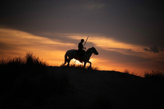 Europe-France-Provence-Camargue horse with rider at sunrise White Modern Wood Framed Art Print with Double Matting by Jaynes Gallery