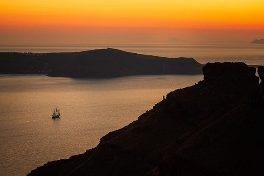 Europe-Greece-Santorini-Sunset on sailboat White Modern Wood Framed Art Print with Double Matting by Jaynes Gallery