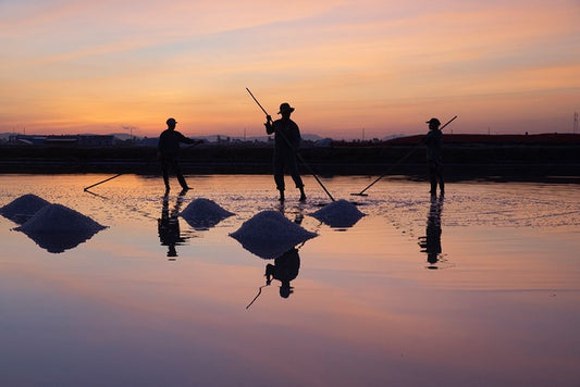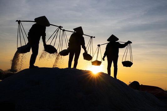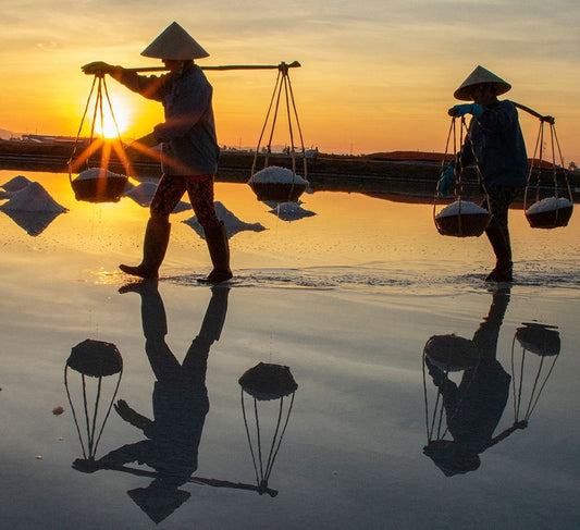 Vietnam-Doc Let Salt lake-Workers harvesting the salt-Early morning sunrise White Modern Wood Framed Art Print with Double Matting by Norring, Tom